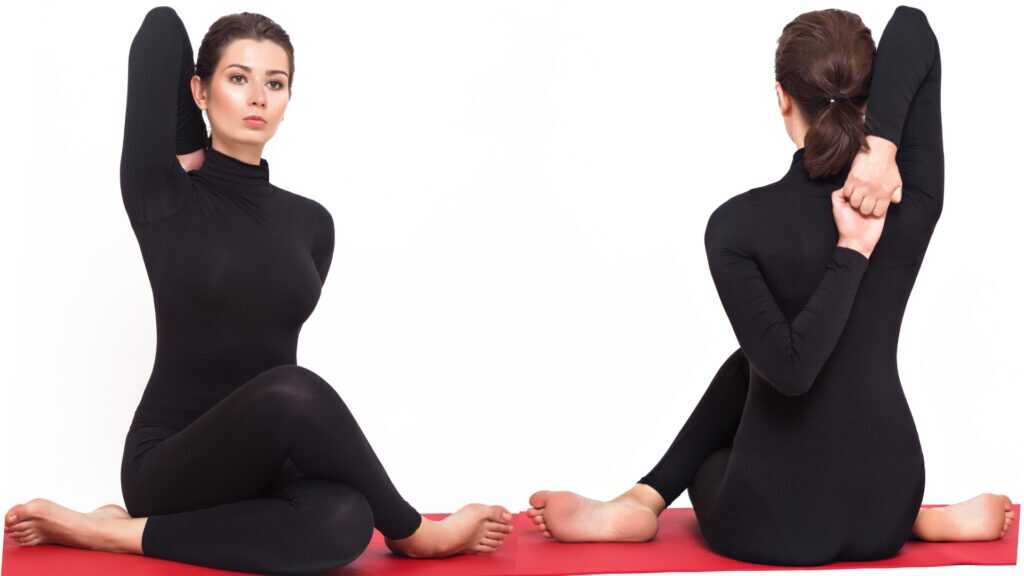 - Half Gomukhasana: If clasping your hands behind your back feels challenging, you can start with Half Gomukhasana. In this variation, only one arm reaches behind the back while the other arm reaches overhead.
